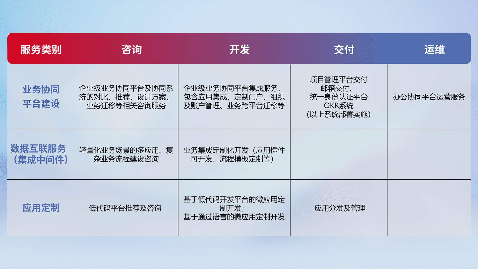 针对钉钉、、、、企微、、、、IDaas等平台级产品提供产品的规划、、、方案、、、交付、、、、定制化开发等服务,,,实现如统一协同办公、、、智能客户服务、、、混合会议管理、、、、智能数据查询、、、等业务场景,,,,实现数字化转型。。